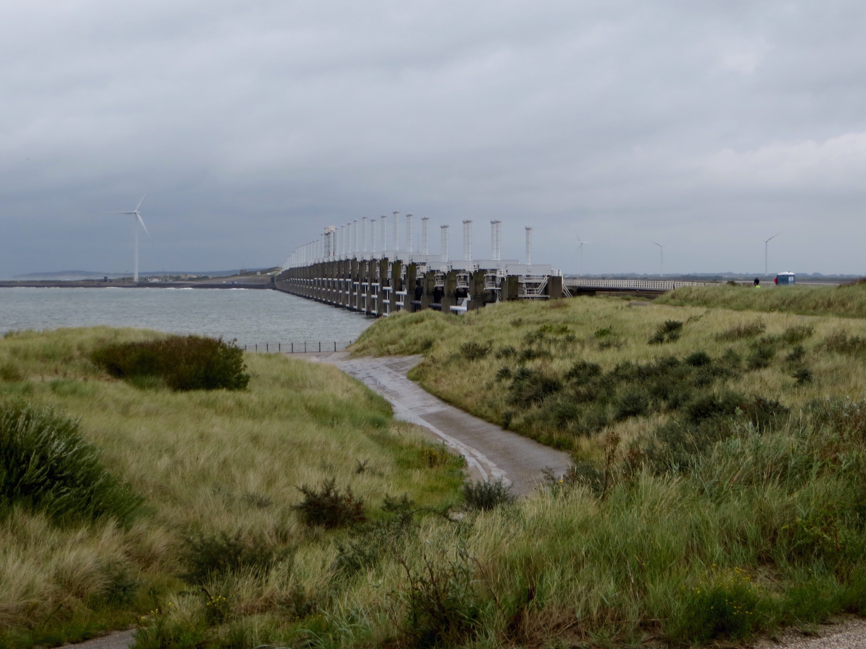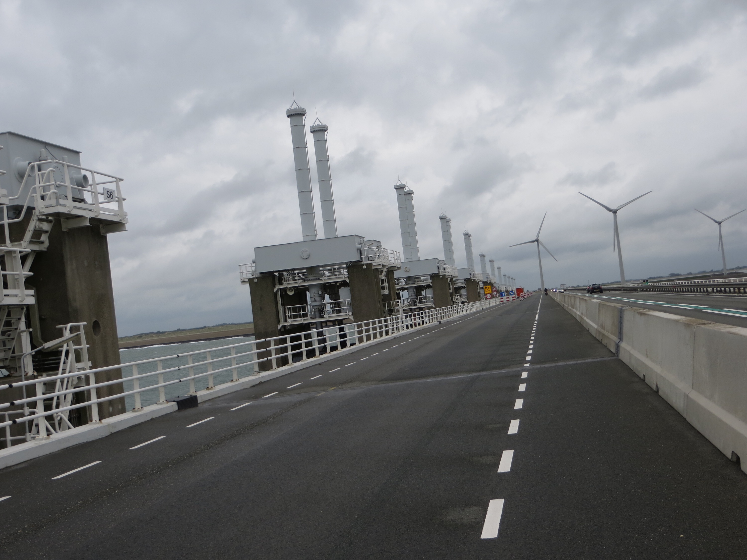 Attraversiamo le famose Opere del Delta…un’istituzione da queste parti…una serie di tredici barriere marine, paratoie e dighe che sono state costruite lungo tutta la costa della Zelanda per proteggere dalle inondazioni l’entroterra che si trova sotto il livello del mare. (Il piano Delta (in nederlandese Deltawerken) è un progetto ideato e avviato in seguito all’inondazione causata dal Mare del Nord nel 1953 nei Paesi Bassi, per evitare il ripetersi di simili catastrofi. L’inondazione aveva infatti causato la morte di 1835 persone e costretto all’evacuazione altre 70.000; annegarono 10.000 capi di bestiame e 4.500 edifici furono distrutti). Abbiamo pedalato sulla cima delle dighe con il mare “aperto” a sinistra e il mare “chiuso” a destra…veramente uno spettacolo insolito…